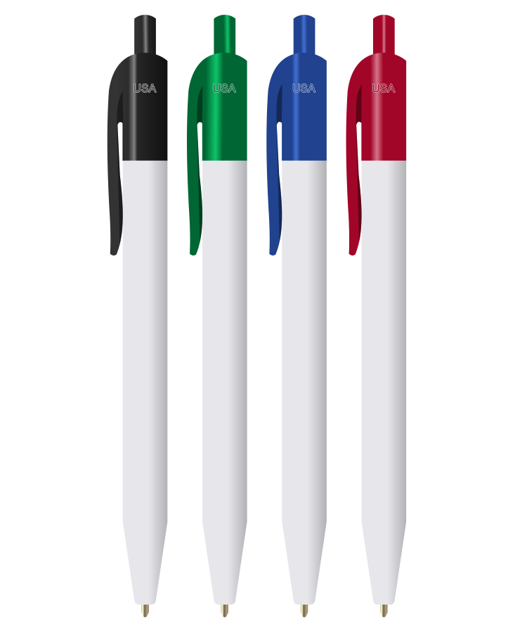 ![]() Union Printed - USA Made - USA ECO White Barrel Click Pens with 1-Color Trim |