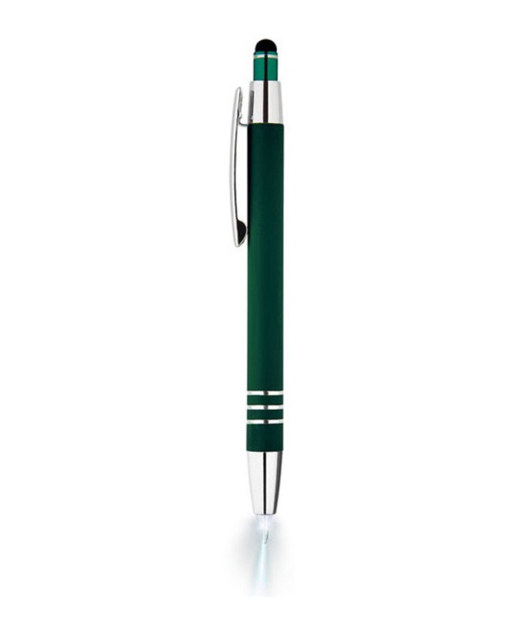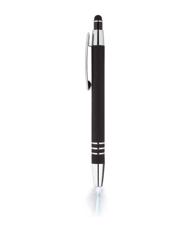 - This sleek metal click pen combines three functions in one smart design: a smooth-writing ballpoint, a built-in stylus for easy touchscreen navigation, and an integrated LED light for added convenience.