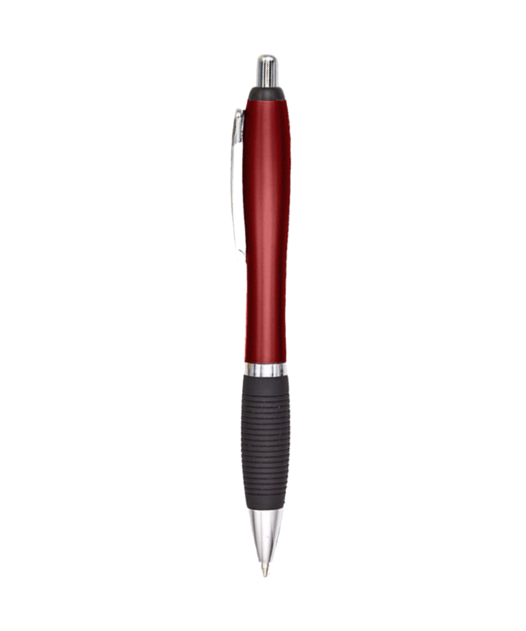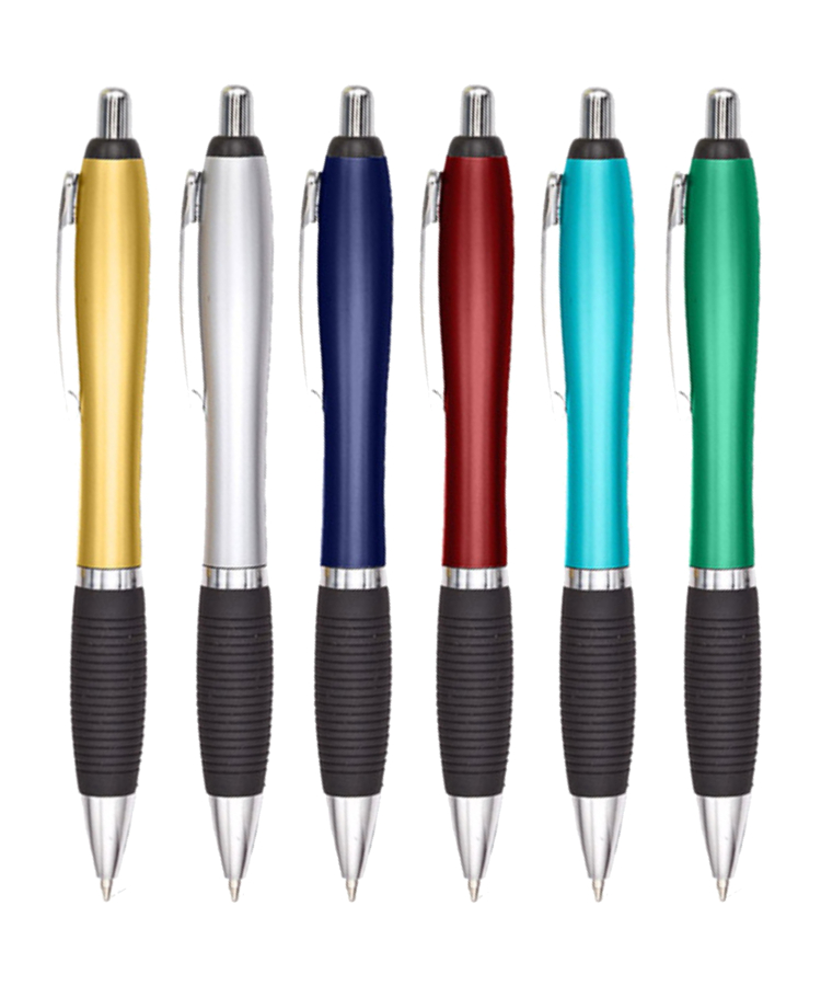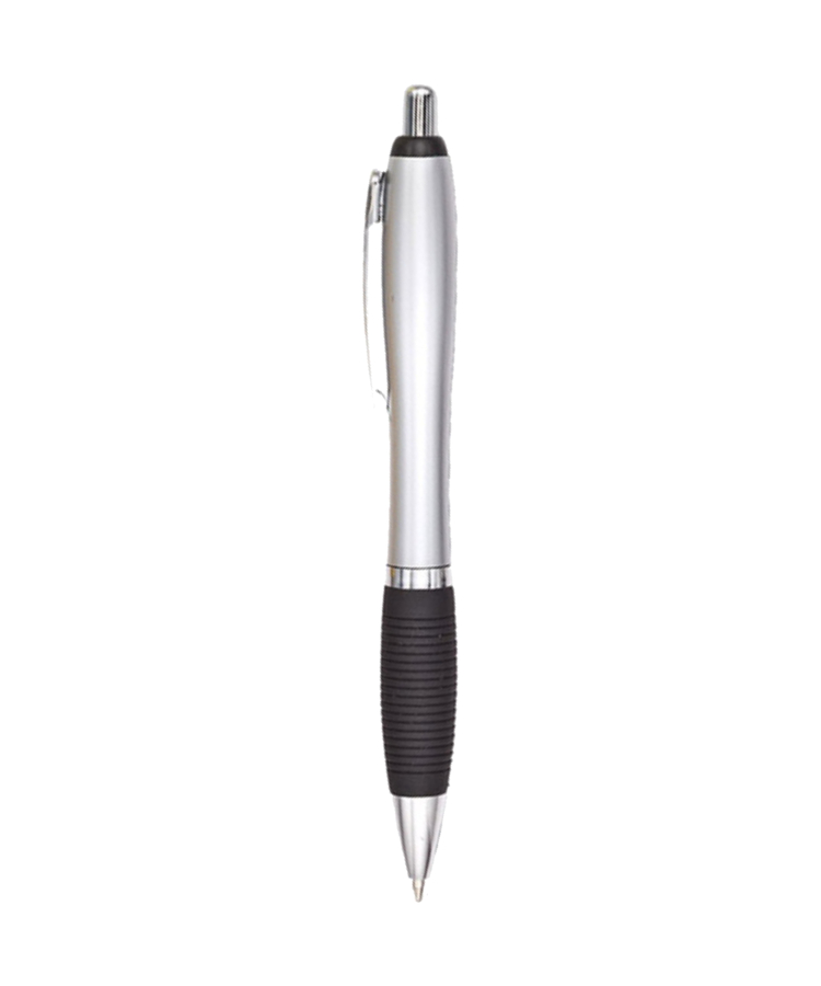 - This stylish click-action pen features a contoured, hourglass-shaped metallic barrel paired with a textured black rubber grip for steady, comfortable writing.