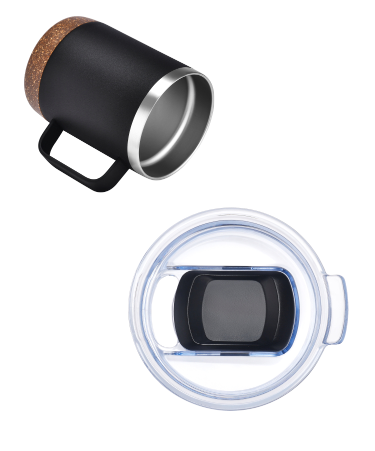 - Made from double-wall powder-coated stainless steel, this mug features a faux cork base to protect surfaces and prevent slipping.