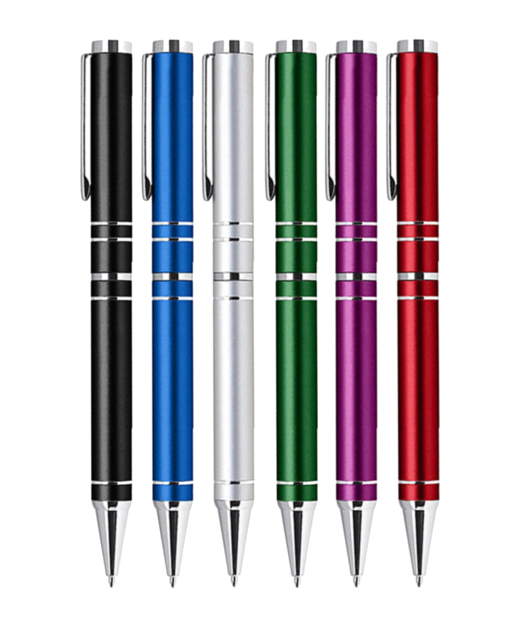 - A sleek twist action aluminum ballpoint pen featuring a bright lacquer finished barrel and gleaming chrome accents.