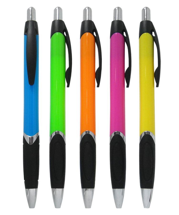 • Union Printed, White "Vegas" Clicker Pen - Tropical Barrels Plunger Action Pen w/ Black Colored Rubber Grip & Black Clip. The White "Vegas" Clicker Pen features eye-catching tropical-colored barrels, a sleek black clip, and a comfortable black rubber grip for smooth writing.