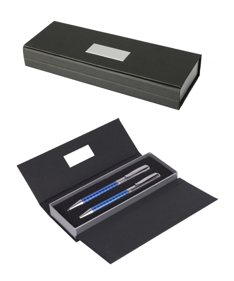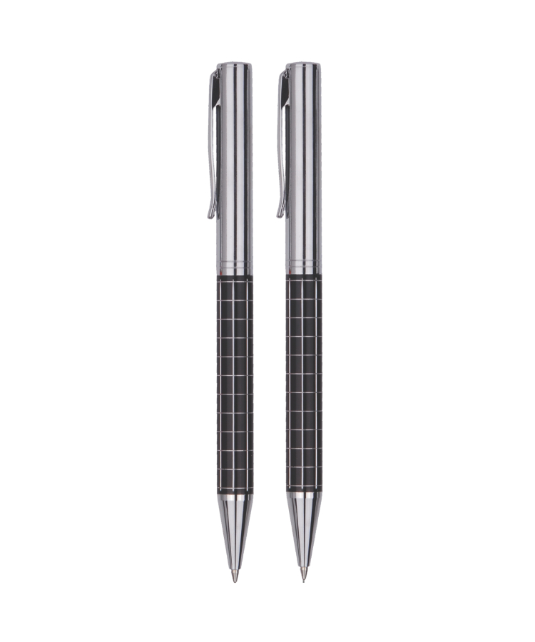 - Featuring a grid-textured heavy metal barrel and polished chrome accents, this set includes a matching mechanical pencil and ballpoint pen in a premium black gift box with a metal plate window.