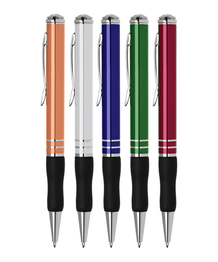 - A durable aluminum twist-action ballpoint pen with smooth writing ink, a black rubber grip, and polished metal accents.