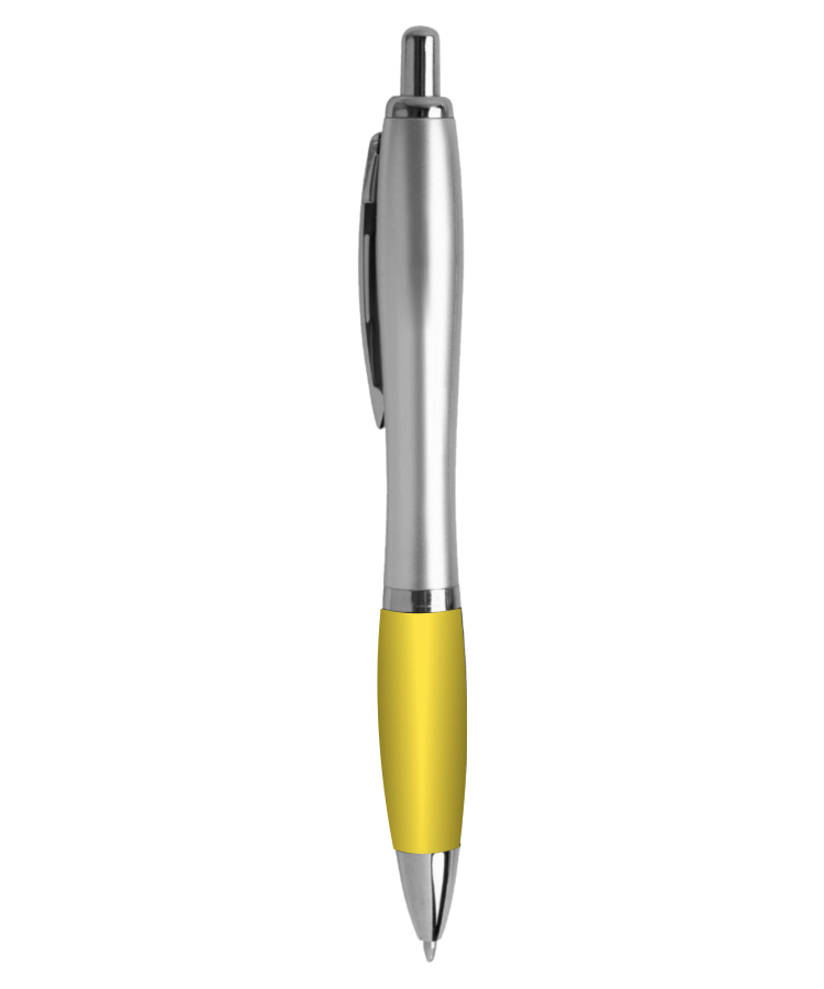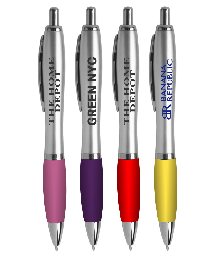 • Union Printed, "Rio Retractable" Silver Barrels Clicker Action Pen w/ Colored Rubber Grips.