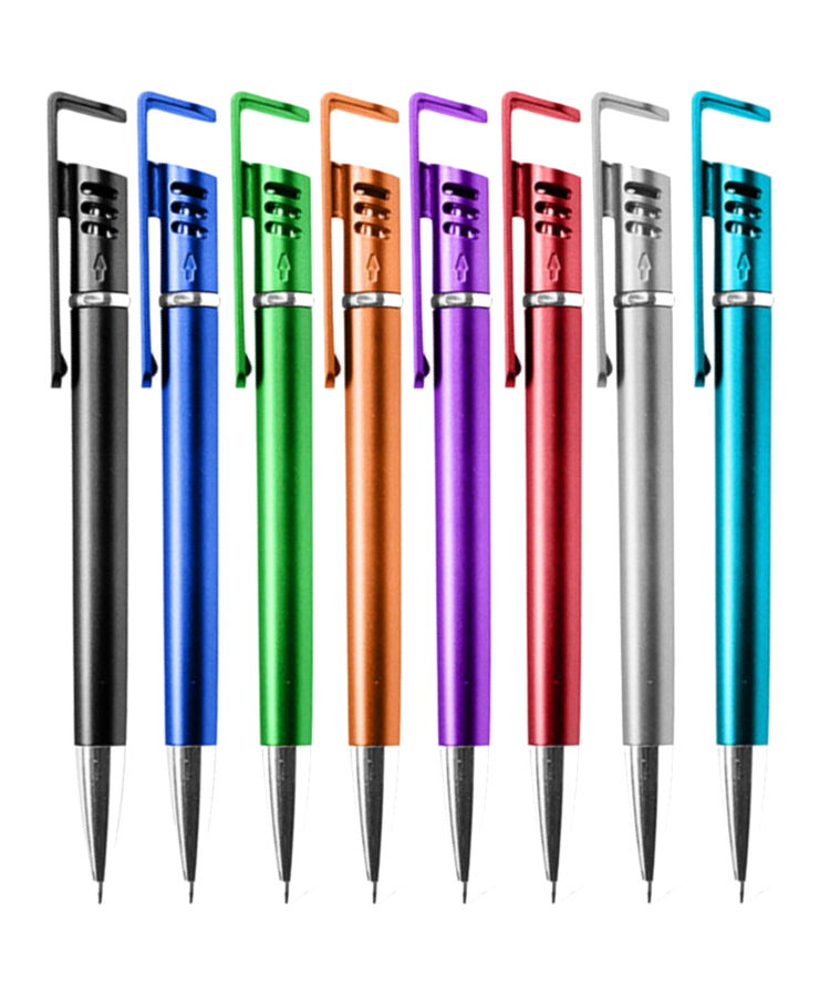 - A versatile, multi-function pen with bold barrel colors, medium-point ink, a built-in stylus, and a cap that doubles as a phone stand.