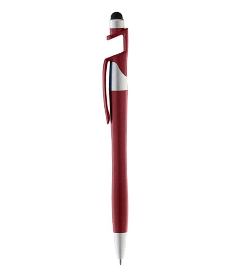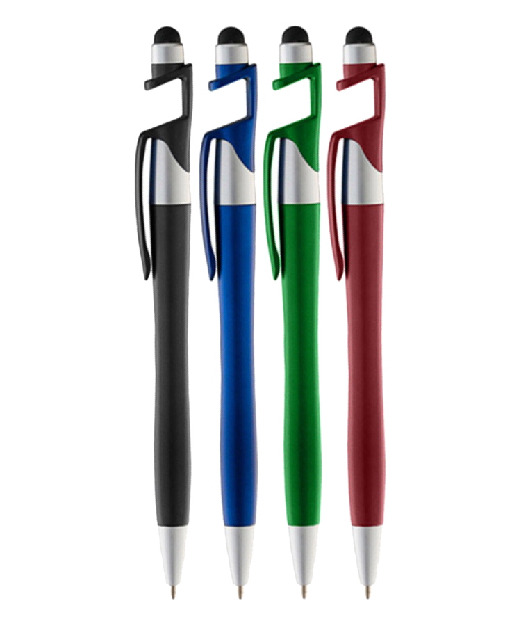 - A twist action pen with a built-in phone stand and stylus.