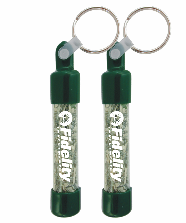 Recycled Cylinder Shaped Key Chain - Filled with Shredded Genuine Currency